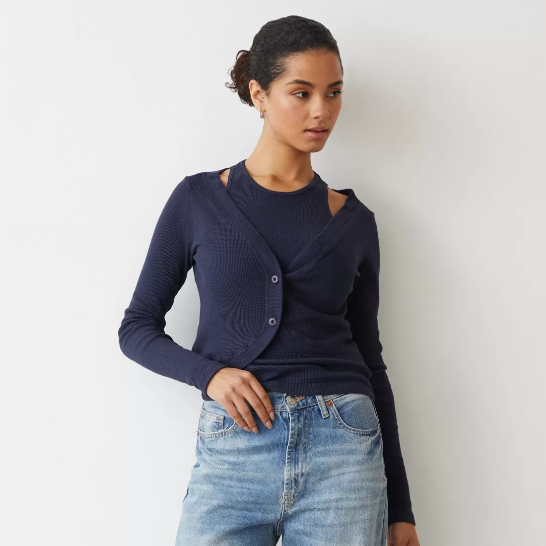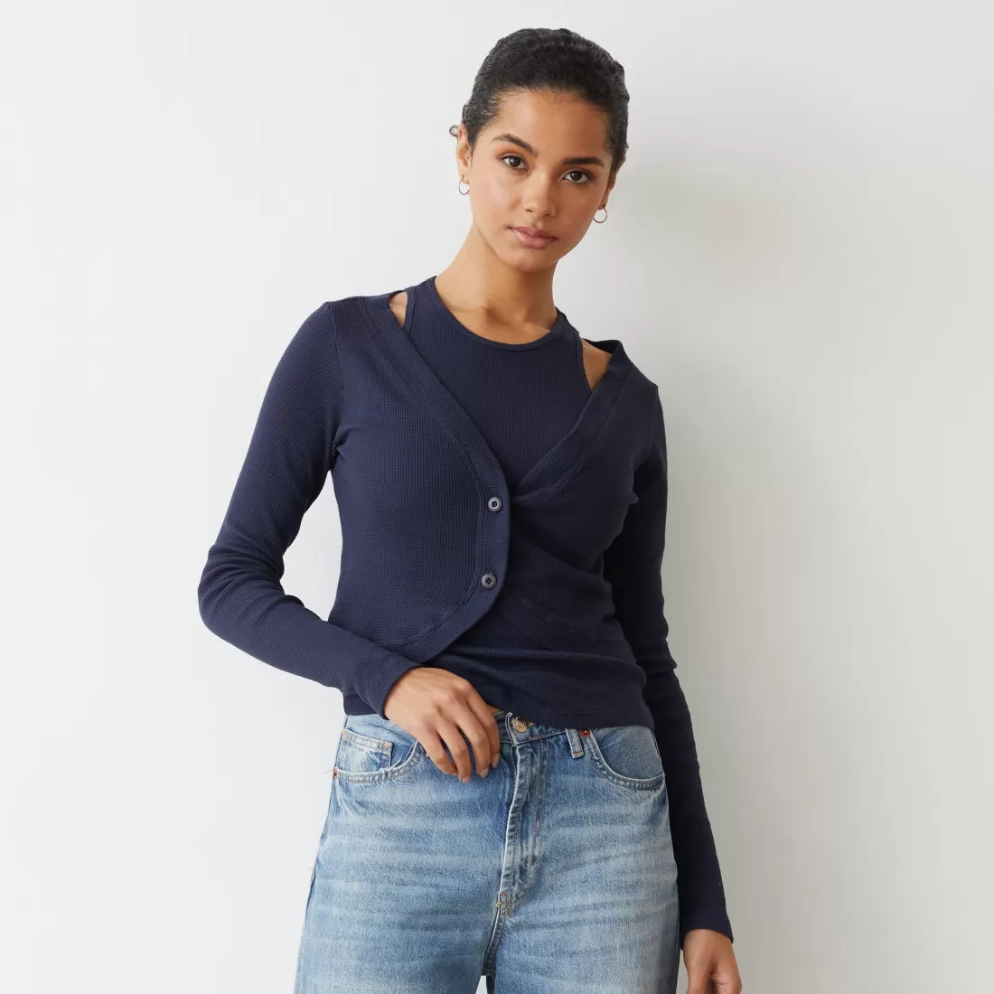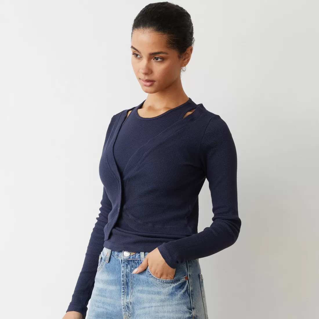 Tank and cardigan attachedRacerback tankCropped long-sleeve cardiganFront button closure48% Cotton, 48% Modal, 4% Spande…